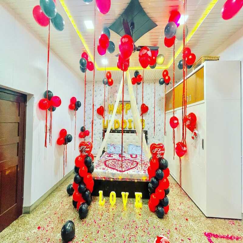 First Night Decoration with Romantic Cabana Setup with flowers.
