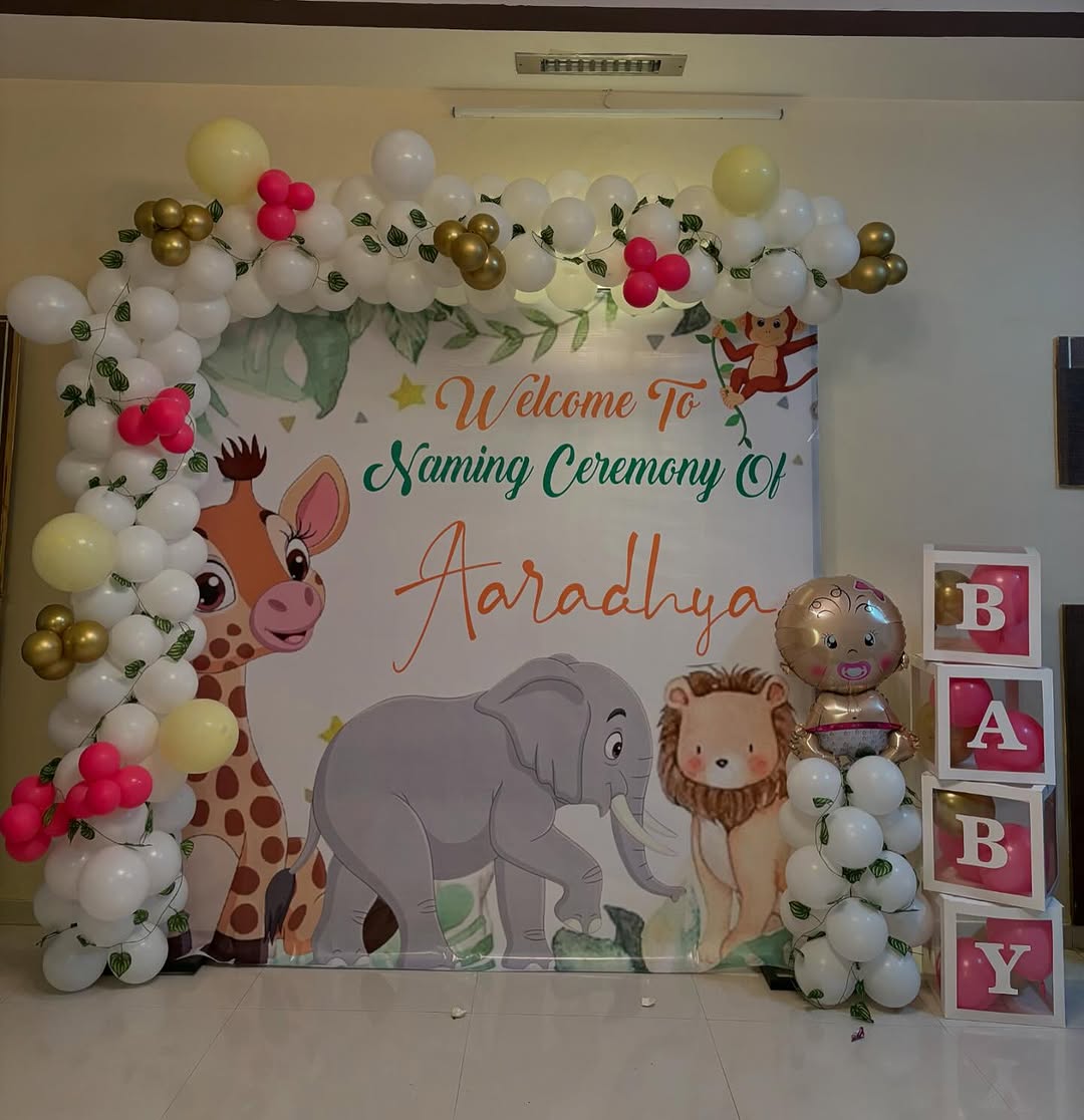 - Total 250 balloons decor as in the image which includes balloons on the main backdrop and few bunches around.