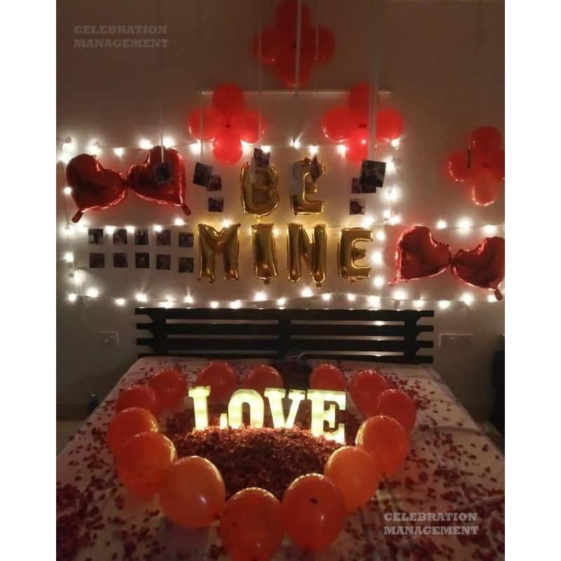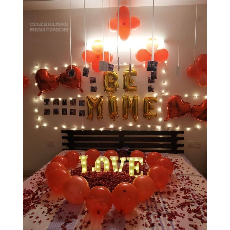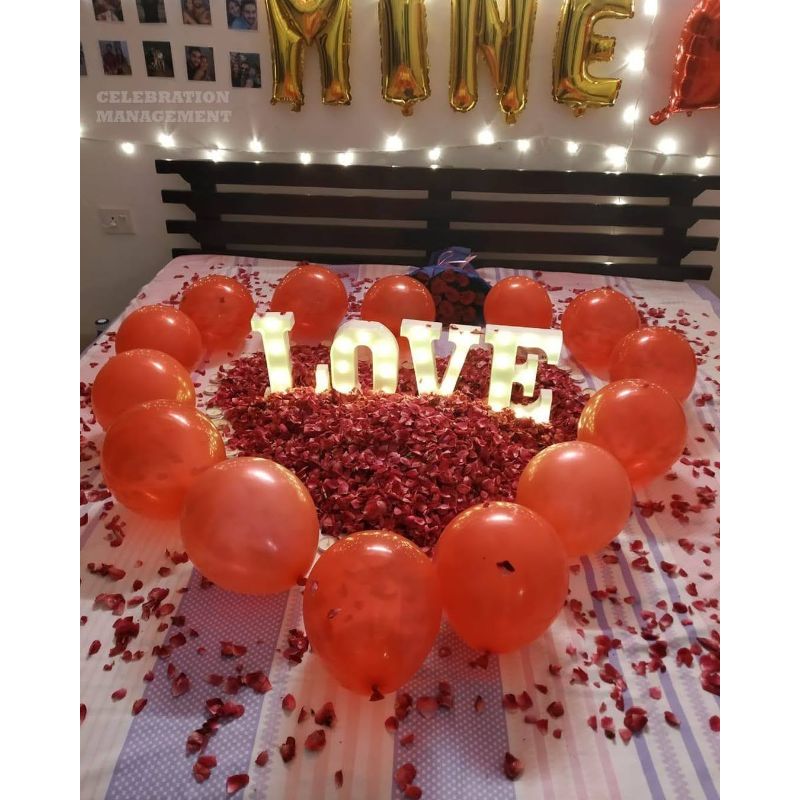 - Heart shape on bed with rose petals with "LOVE" led letters in the centre.