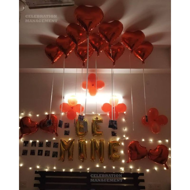 - 15 red heart shaped foil balloons used on ceiling with ribbons and around.
